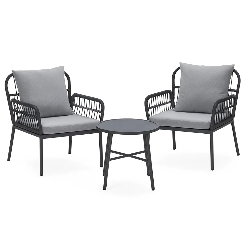 - Chaises: 2, métal, gris, largeur 70 cm x profondeur 67 cm x hauteur 78 cm
